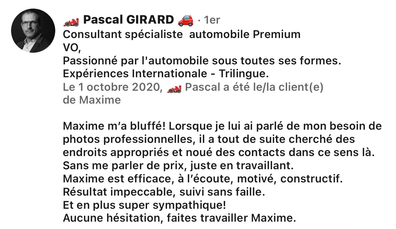 Je ne suis peut-être pas le "meilleur" photographe technique, mais je suis un passionné. Quel que soit votre projet, j'y mettrai tout mon cœur pour rendre le résultat unique. Que ce soit pour une mise en scène futuriste dans un avion ou pour traverser la France pour un projet fou, je le ferai. Mon souhait est de continuer à mettre en avant vos véhicules et vos projets avec ce regard différent.